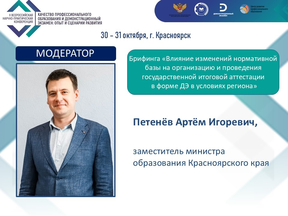 На брифинге, посвященном теме «Влияние изменений нормативной базы на организацию и проведение государственной итоговой аттестации в форме ДЭ в условиях региона», он затронет ключевые вопросы, регламентирующие различные стороны организации и проведения демонстрационного экзамена образовательными организациями, реализующими образовательные программы СПО.